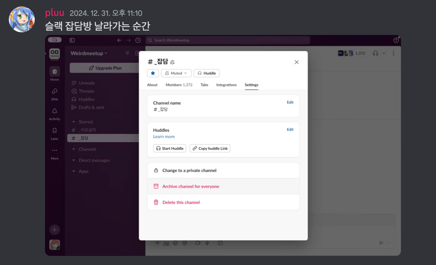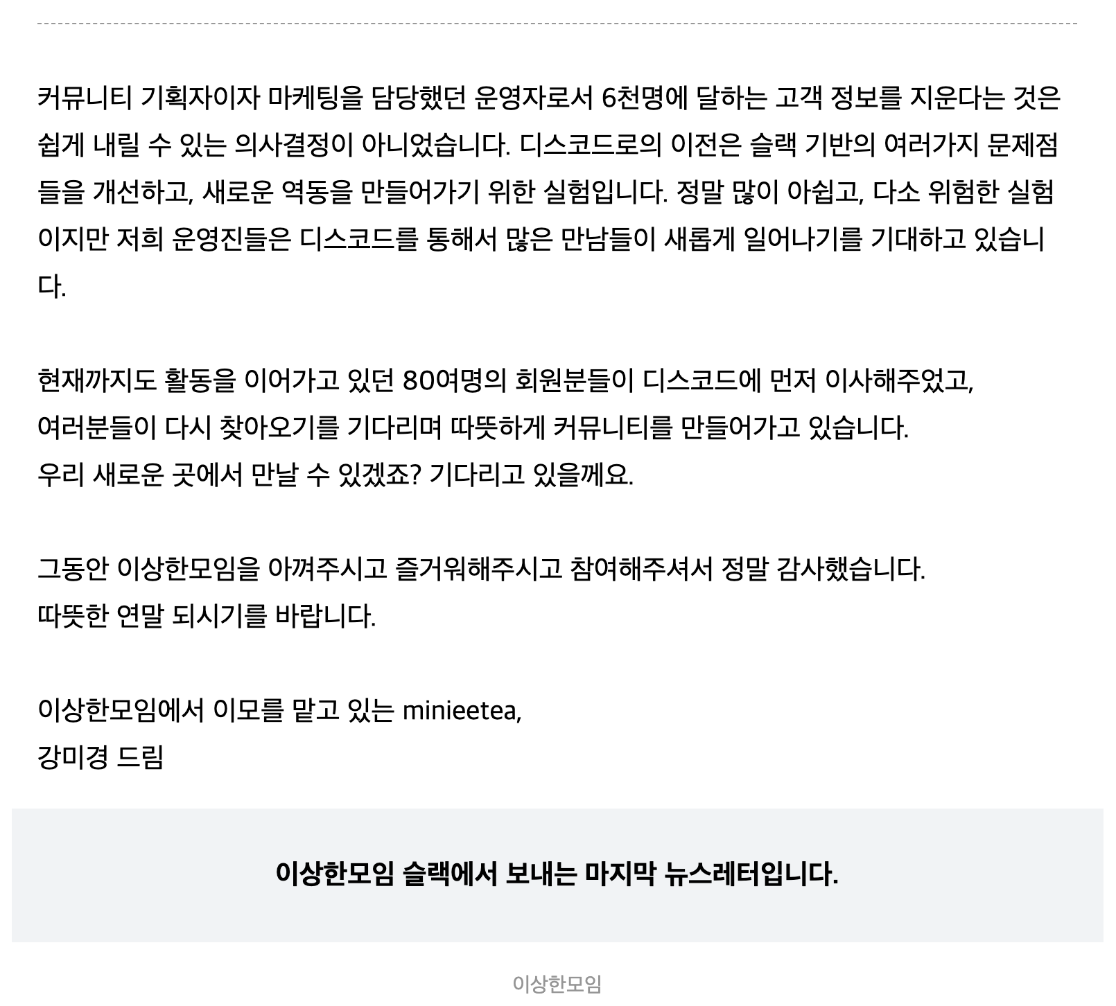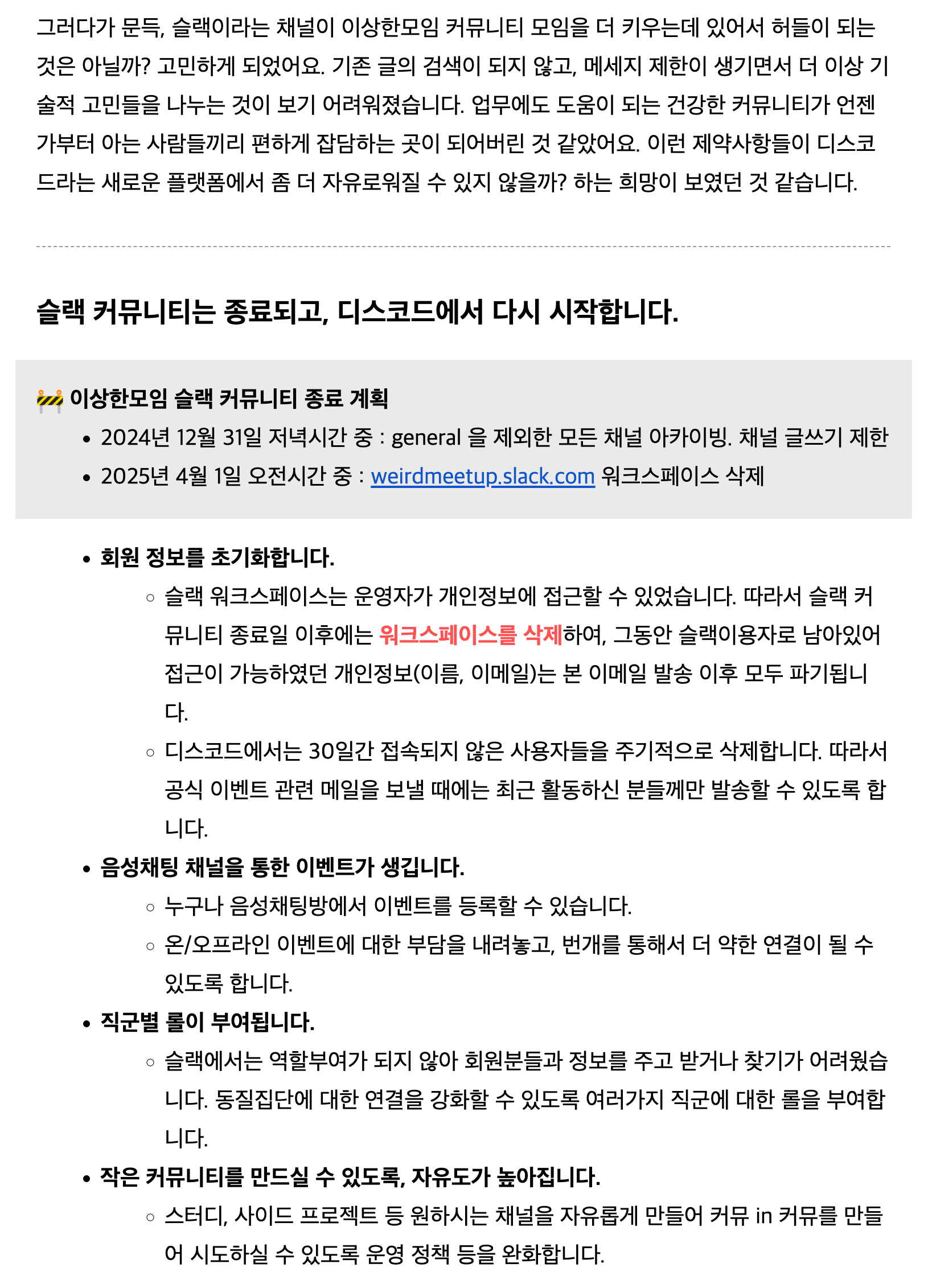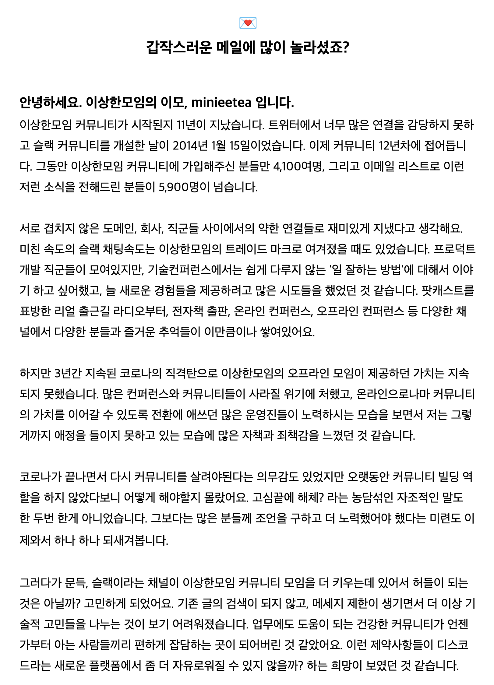 이상한모임이라는 커뮤니티 운영을 맡은지 벌써 8년차다. (돈받고 다니는 회사도 1년마다 갈아치운 인내력을 생각해보면 엄청난 기간임) 회사업무와 코로나를 핑계로 2-3년씩 휴지기를 갖고 있긴 하나 그건 운영자로서 행사운영을 중단한 것 뿐이지, 아직 이상한모임 도메인도 있고, 슬랙 사용자도 꾸준히 대화를 하고있다. 이제 슬랙 활성유저가 몇인지, 얼마나 많은 사람들이 참여해서 대화를 나누고 있는지 정확히 알지는 못하지만 회사 슬랙에 연동해두었으니 채널에 새 글이 꾸준히 뜬다는 것은 알고 있다. (새글 뱃지 붙는게 싫은데 설정은 안끄면서 매번 들어가서 지워주는 종족임)